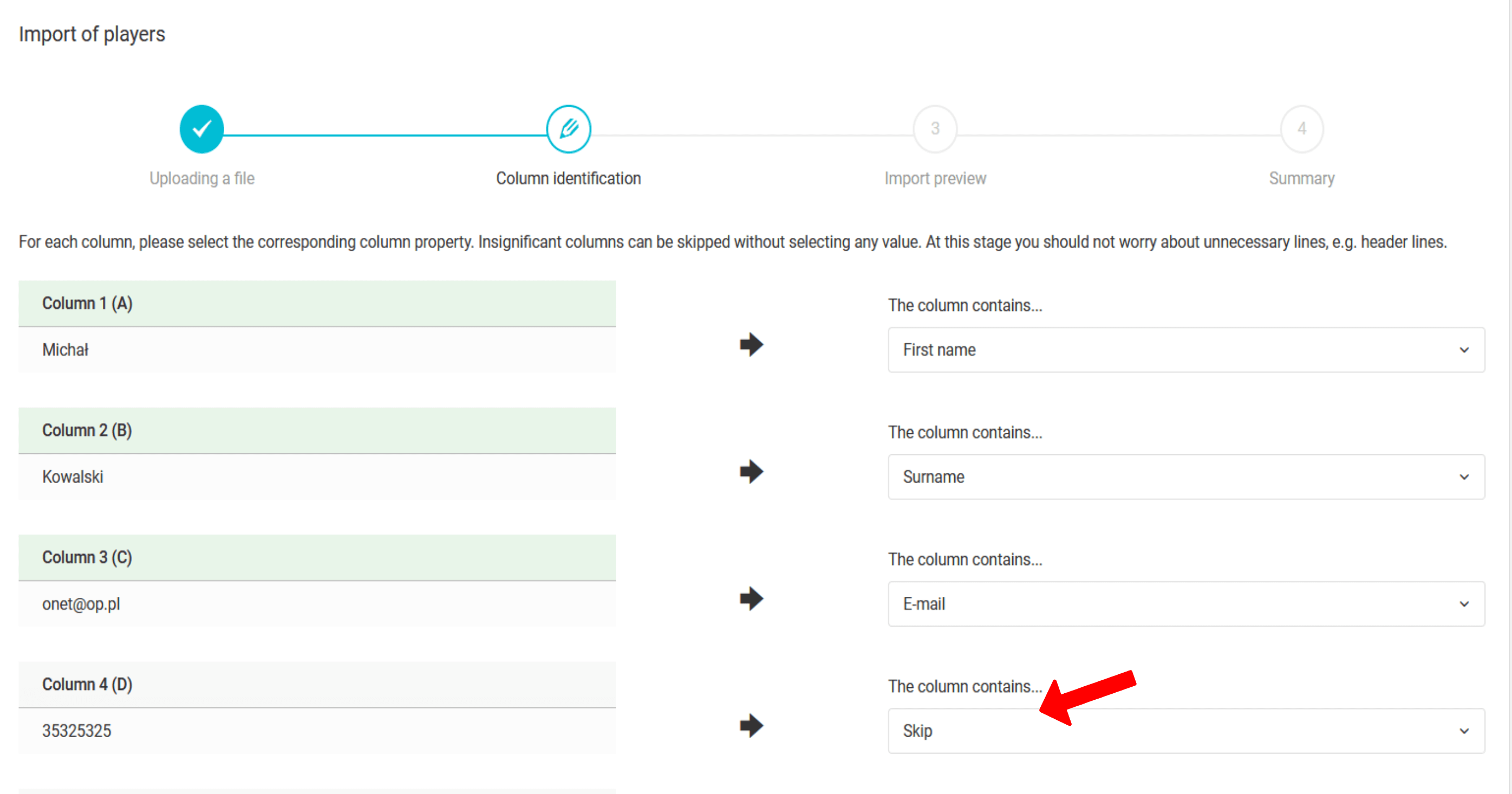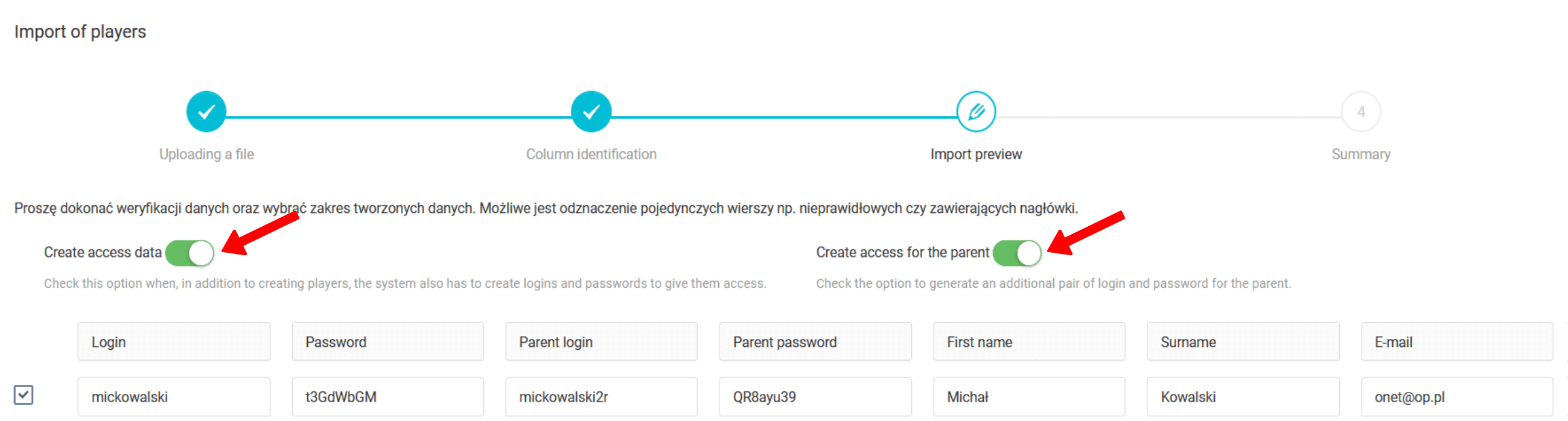Po nahrání souboru do systému musíte projít procesem identifikace sloupců. Spočívá v přiřazení příslušného typu dat k prvku umístěnému v každém sloupci. Na obrázku jste již identifikovali sloupce se jménem, příjmením a e-mailovou adresou. Telefonní číslo se používá k identifikaci, takže musíte z rozbalovacího seznamu vybrat možnost "telefon". V dalším kroku se rozhodnete, zda chcete pro vytvořené účty vygenerovat přihlašovací jméno a heslo a zda chcete vytvořit účty opatrovníků.