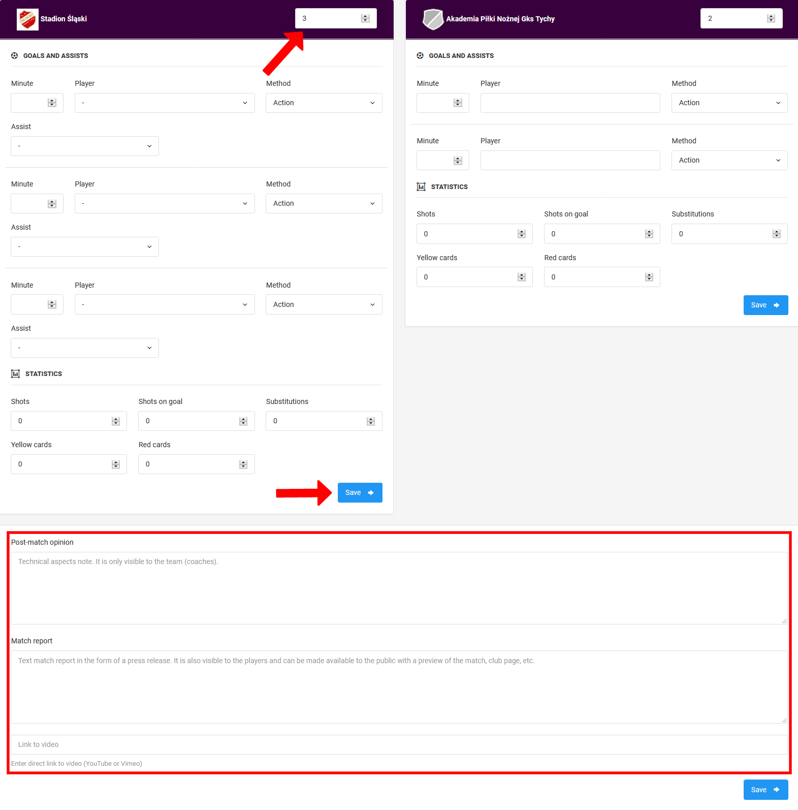 The advanced view allows you to enter extensive statistics for a given match. In this window, depending on the chosen sport, you can enter information about: goals, points, assistants, shots, substitutions, penalties, and how goals were scored. Remember to save the form every time. Saving the quantitative data will also allow you to add qualitative data such as goal scorers, assistant goals, etc. Below the form, you will find three text fields: match opinion, match report and a link to the video.