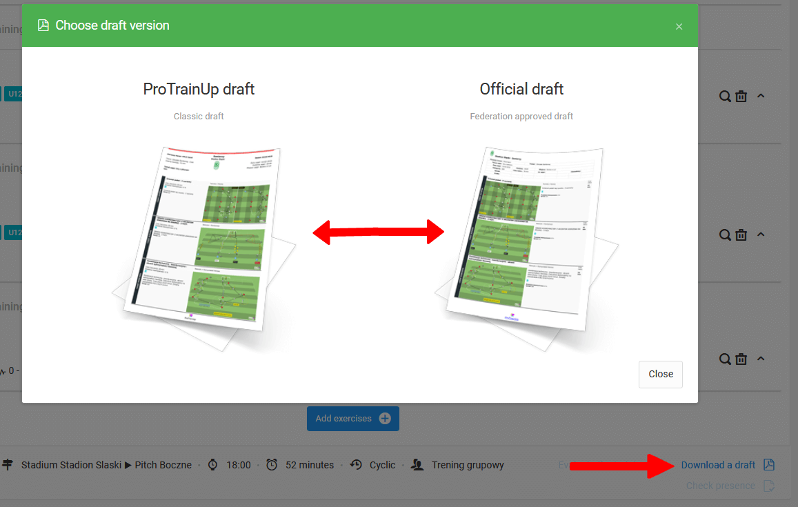 To download a pdf draft, click on the "download draft" button, which is located under the selected training in the tab diary trainings schedule. Then select the draft template you want to download to your computer.
